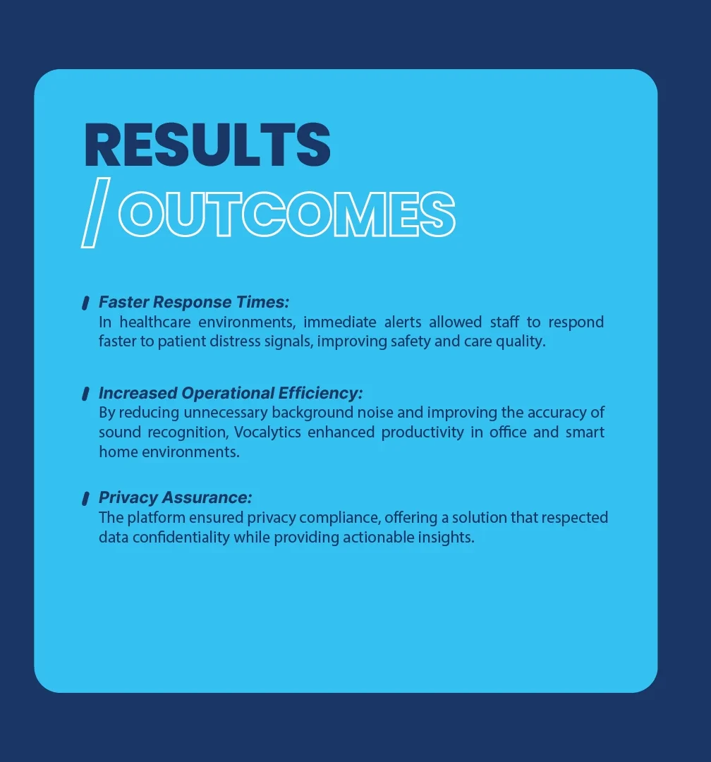 The upgraded Vocalytics platform enabled faster, smarter sound-based decision-making across multiple industries. Real-time alerts significantly improved safety in healthcare settings, while optimized sound recognition reduced noise distractions in offices and smart homes. Privacy-first compliance ensured secure deployment without compromising sensitive information.